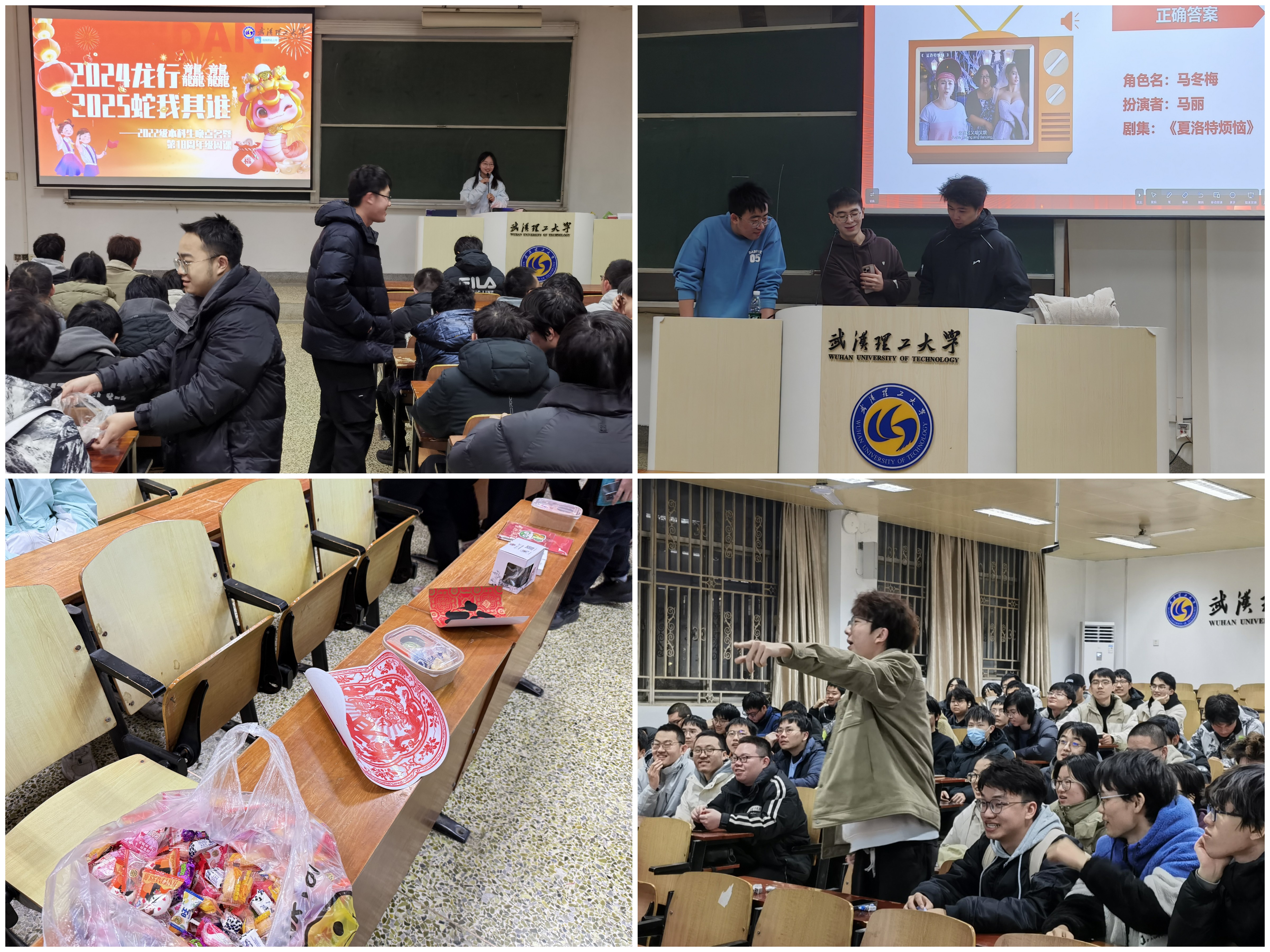 在轻松愉快的游戏环节,辅导员和同学们一起玩起了听台词猜明星、看图猜成语等游戏。在游戏过程中,同学们热情高涨,积极参与,现场气氛十分活跃。两位辅导员还为上台答题的同学们送去了新年礼物。大家在欢声笑语中放松了心情,也进一步增强了团队凝聚力和班级归属感。
